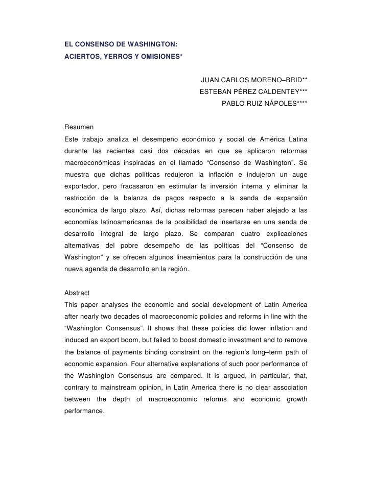 Se muestra que dichas polticas redujeron la inflacin e indujeron un auge exportador pero fracasaron en estimular la inversin interna y eliminar la restriccin de la balanza de pagos. Se conoce como Consenso de Washington a un conjunto. Resumen Este trabajo analiza el desempeo econmico y social de Amrica Latina durante las recientes casi dos dcadas en que se aplicaron reformas macroeconmicas inspiradas en el llamado Consenso de Washington.