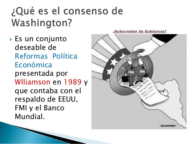 - Subido por David Iman. Que se implement el Consenso de Washington y adems por la fuerte injerencia del Fondo Monetario Internacional en este pas en la formulacin de prcticamente toda su poltica econmica en la dcada del 90. Comparte tu material de estudio en uDocz y ayuda a miles como t.