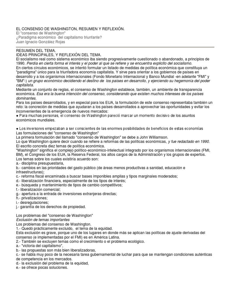 Sin embargo tras ms de 25 aos de aplicacin del citado Consenso son contradictorios muchos de los resultados alcanzados en. Resumen detallado del consenso de Washington. Dagoberto Daz Introduccin A principios de 1990 tras la cada del muro de Berln haca aos que el socialismo iba siendo progresivamente abandonado.