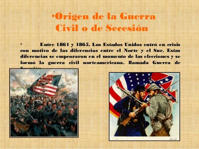 Afrontarse el futuro del pas. Add an external link to your content for free. La guerra de Secesin o guerra civil americana fue un conflicto en la historia de los Estados Unidos de Amrica que tuvo lugar entre 1861 y 1865 donde los dos bandos enfrentados fueron las fuerzas de los estados del Norte la Unin contra los recin formados Estados Confederados de Amrica integrados por once estados del Sur que proclamaron su independencia.
